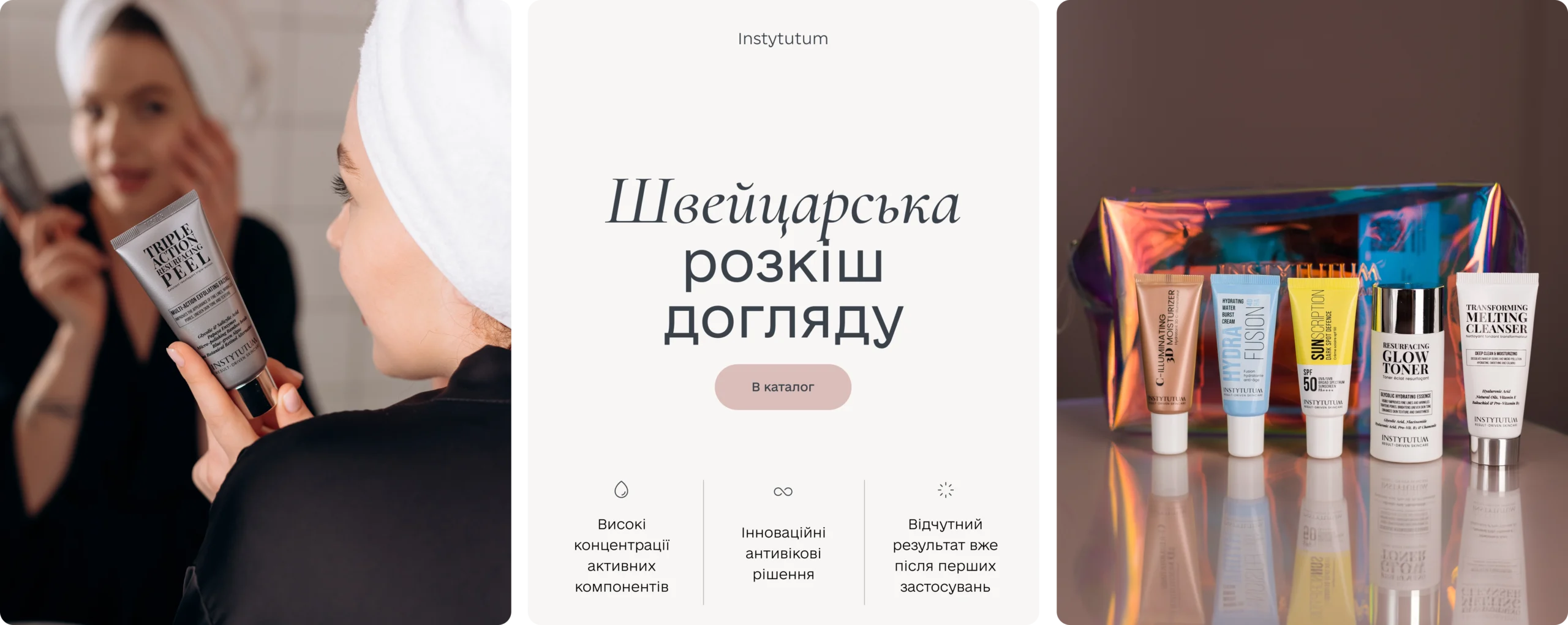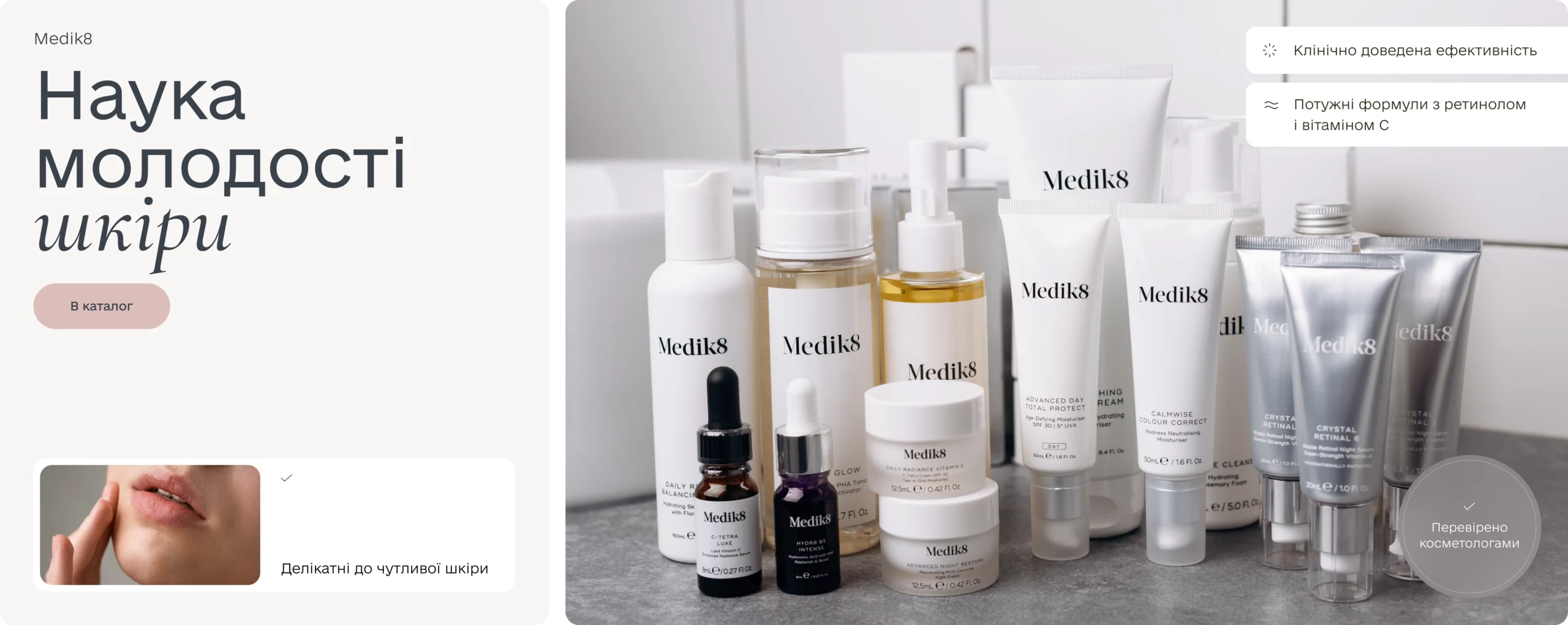 Ми підбираємо професійну доглядову косметику для жінок і чоловіків, враховуючи індивідуальні особливості вашої шкіри. Вам не потрібно витрачати час на пошуки – наші косметологи підберуть оптимальний догляд і супроводжуватимуть вас на всіх етапах його використання.
