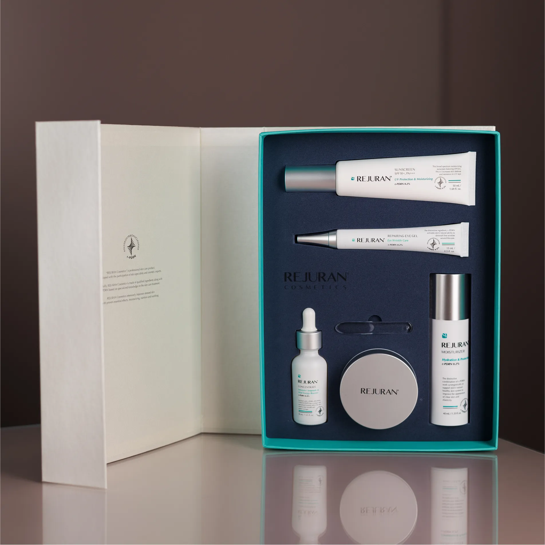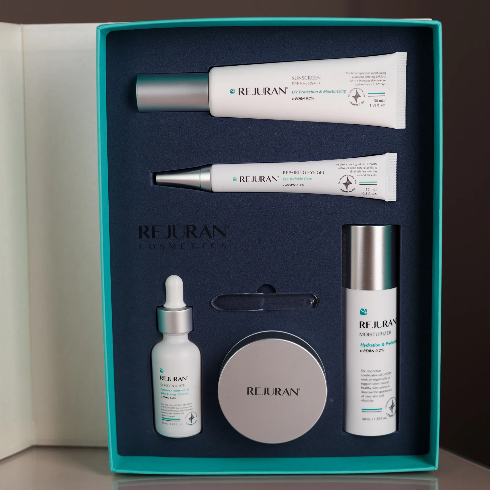 1. Healing Eye Gel: Water, Aloe Barbadensis Leaf Juice (Colorless), Calendula Officinalis (Calendula) Flower Extract*, Cucumis Sativus (Cucumber) Seed Extract, Rubus Fruticosus (Blackberry) Leaf Extract, Glycerin, Sodium Hyaluronate, Pelargonium Graveolens (Lavender) Oil, Polysorbate 20, Glycereth-26, Carbomer, Sodium Acrylate/Sodium Acryloyldimethyl Taurate Copolymer, Lecithin, Hydrolyzed Dna, Xanthan Gum, Glyceryl Polyacrylate, Adenosine, Bis-Peg-18 Methyl Ether Dimethyl Silane, Tocopheryl Acetate, Phenoxyethanol, Benzyl Alcohol. Organic Ingredients Of C-Pdrn. 2. Concentrate Rejuvenating Vital Energy Booster: Aloe Vera Leaf Juice, Rubus Fruticosus (Blackberry) Leaf Extract, Vaccinium Angustifolium (Blueberry) Fruit Extract, Black Mulberry Extract, Cucumis Sativus (Cucumber) Seed Extract, Daucus Carota Sativa (Wild Carrot Root) Root, Marigold Officinalis Flower Extract, Caprylic/ Capric Triglyceride, Citrus Aurantium Dulcis (Sweet Orange) Peel Extract, Borago Officinalis (Borage) Seed Oil, Panthenol, Glycerin, Glycyrrhiza Glabra (Licorice) Root Extract, Caprylyl Glycol, Argan Oil, Sodium Ascorbyl Phosphate, Allantoin, Chitosan, Sodium Hyaluronate , Arbutin, Hydrolyzed Dna, Adenosine, Xanthan Gum, Hydroxyethylcellulose, Carbomer, Dimethicone, Cyclopentasiloxane, Phenoxyethanol, Sodium Benzoate, Fragrance (Natural Essential Oils). 3. Moisturizer Hydration Protecting Cream: Aloe Vera Leaf Juice, Punica Granatum (Pomegranate) Seed Oil, Rubus Fruticosus (Blackberry) Leaf Extract, Vaccinium Angustifolium (Blueberry) Fruit Extract, Borago Officinalis (Borage) Seed Oil, Rosehip Fruit Oil, Argan Oil, Flower /Leaf/ Extract Fragrant Pelargonium (Pink Geranium) Stems, Citrus Aurantium Dulcis (Sweet Orange) Peel Extract, Simmondsia Chinensis (Jojoba) Seed Oil, Glycerin, Butyrospermum Parkii (Shea Butter) Butter, Caprylic/Capric Triglyceride, Olive Oil Squalane, Cetyl Alcohol, Dimethicone, Glyceryl Stearate, Cetearyl Alcohol, Avena Sativa (Oat) Extract, Glycyrrhiza Glabra (Licorice) Root Extract, Panthenol, Tocopheryl Acetate, Caprylyl Glycol, Ethylhexylglycerin, Sodium Hyaluronate, Hydrolyzed DNA, Adenosine, Phenoxyethanol, Sodium Benzoate, Fragrance (Natural Essential Oils). 4. Sunscreen SPF 50+/PA+++: Punica Granatum (Pomegranate) Seed Oil, Morus Nigra (Black Mulberry) Fruit Extract, Rubus Fruticosus (Blackberry) Butyrospermum Parkii (Shea Butter), Avena Sativa (Oat) Kernel Extract, Ethylhexyl Salicylate, Benzophenone-3, Butyl Methoxydibenzoylmethane, Glycerin, Octocrylene, Dimethicone, Panthenol, Caprylic/Capric Trig Alcohol, Glyceryl Stearate , Tocopheryl Acetate, Glycyrrhiza Glabra (Licorice) Root Extract, Ethylhexylglycerin, Caprylyl Glycol, Sodium Hyaluronate, Hydrolyzed DNA, Phenoxyethanol, Sodium Benzoate, Fragrance (Natural Essential Oils). 5. Healing Cream Intensive Premium Activator: Aloe Vera Leaf Juice, Simmondsia Chinensis (Jojoba) Seed Oil, Punica Granatum (Pomegranate) Seed Oil, Argan Oil, Pelargonium Graveolens (Pink Geranium) Flower/Leaf/Stem Extract, Citrus Aurantium Dulcis (Sweet Orange) Peel Extract, Cucumis Seed Extract Sativus (Cucumber), Borago Officinalis (Borage) Seed Oil, Rosehip Fruit Oil, Shea Butter (Butyrospermum Parkii), Glycerin, Caprylic/Capric Triglyceride, Olive Oil Squalane, Cetyl Alcohol, Dimethicone, Glyceryl Stearate, Cetearyl Alcohol, Avena Sativa Extract ( Oat), Sodium Hyaluronate, Panthenol, Tocopheryl Acetate, Ethylhexylglycerin, Caprylyl Glycol, Glycyrrhiza Glabra (Licorice) Root Extract, Hydrolyzed DNA, Adenosine, Phenoxyethanol, Sodium Benzoate, Carbomer, Fragrance (Natural Essential Oils).